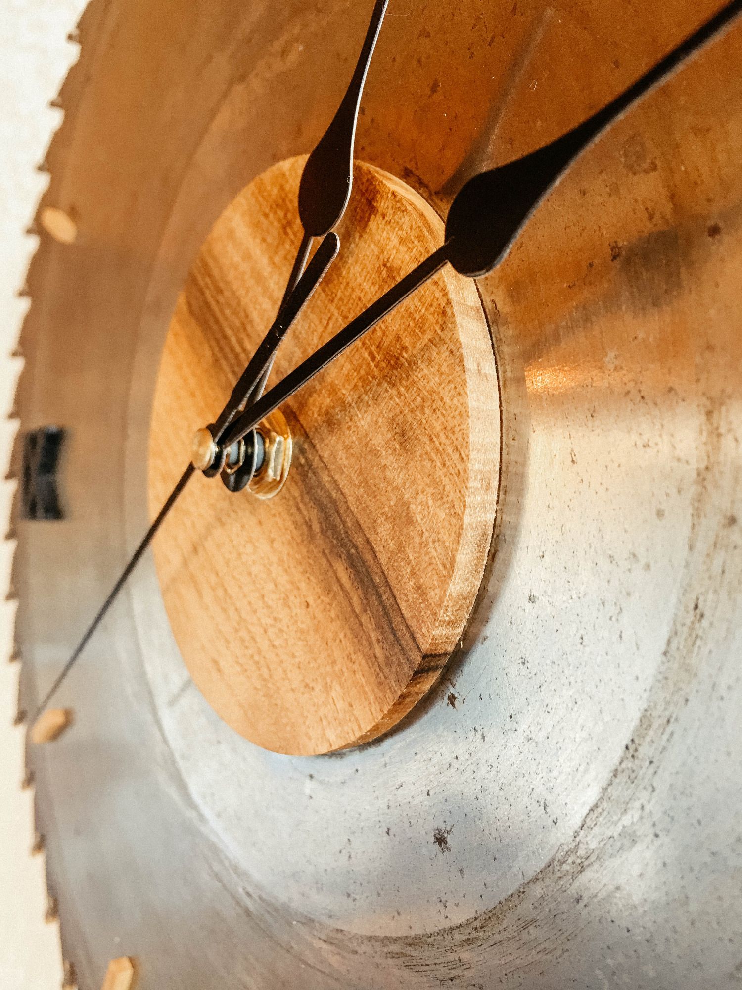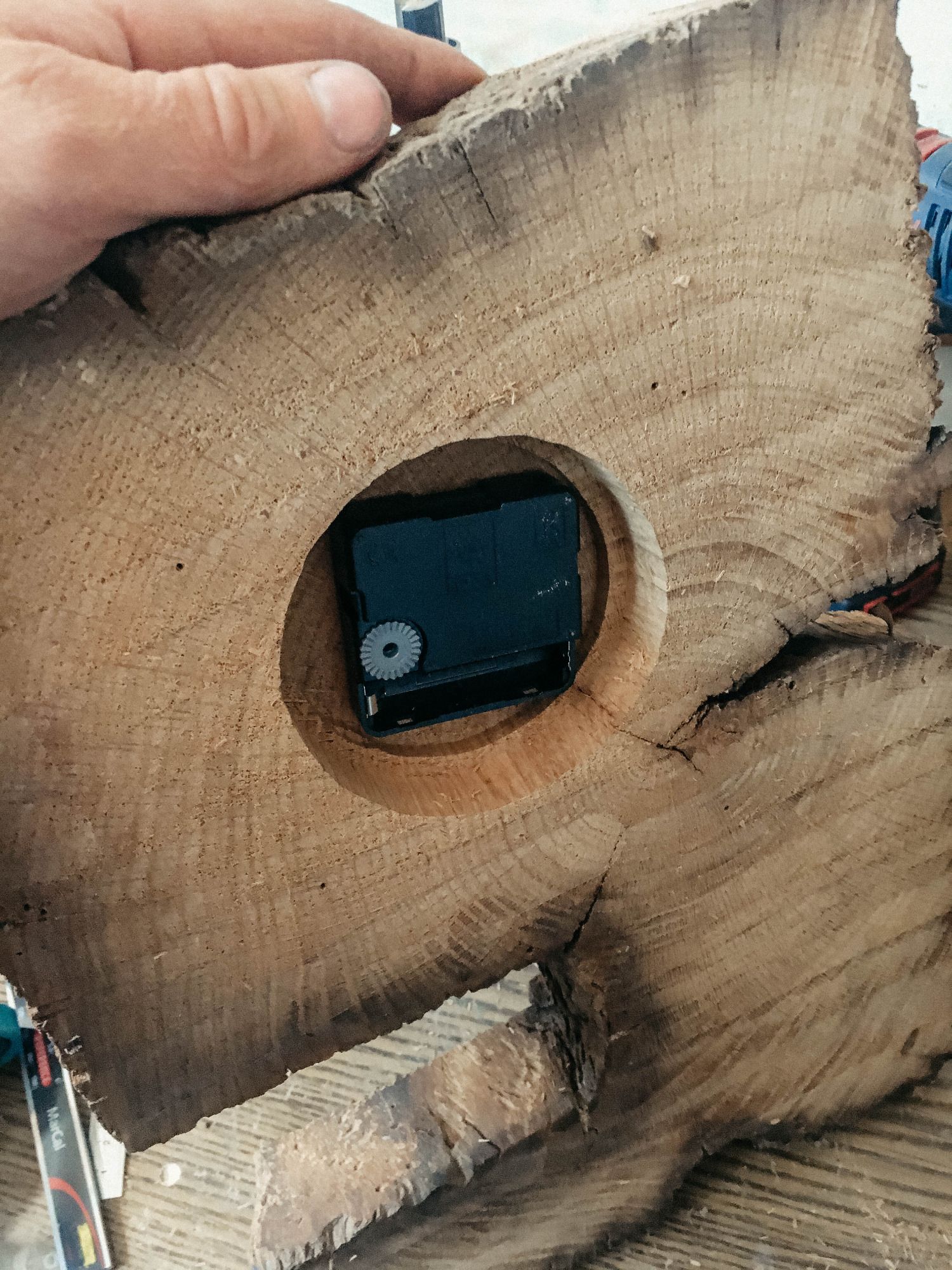 Das Zifferblatt besteht aus einem über 400 Jahre alten Eichenbalken eines Fachwerkhauses. Bei der Herstellung versuche ich, möglichst viel der alten Balkenstruktur zu erhalten.